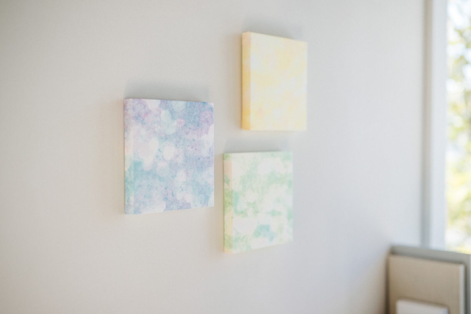届いたその日に壁に飾れるよう一つのパネルにつき2つの画鋲をおつけしています。
